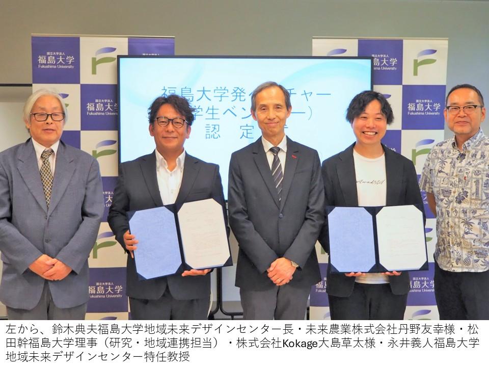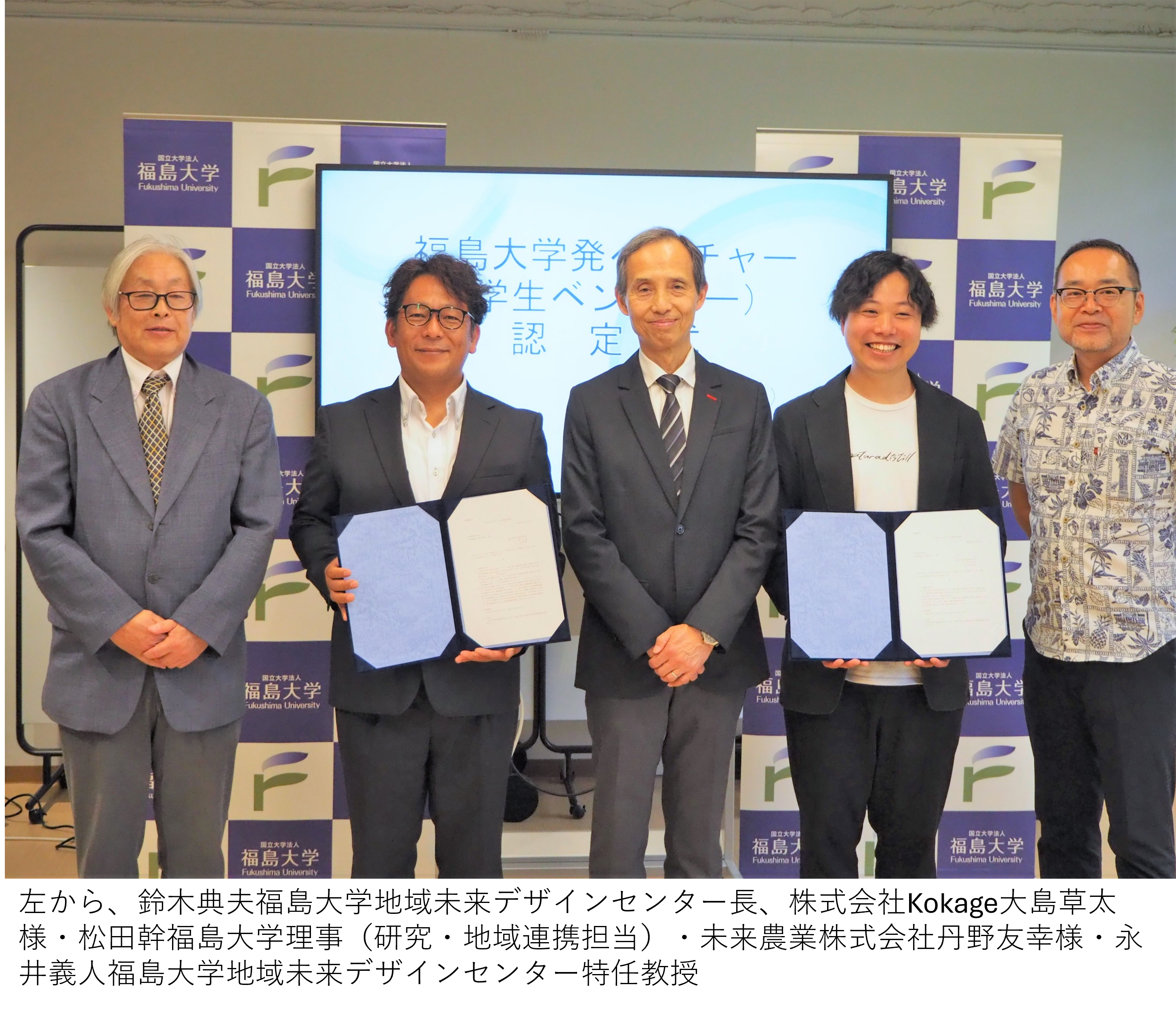 8月19日(火)、福島大学地域未来デザインセンターにて、鈴木典夫福島大学地域未来デザインセンター長進行のもと、新たに大学発ベンチャーとして認定された株式会社Kokage 代表取締役 大島草太様・未来農業株式会社 代表取締役 丹野友幸様にご出席いただき、認定式を挙行しました。