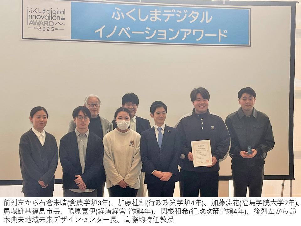 2026年1月22日に授賞式が開催され、学生代表の鴫原寛伊さん(経済経営学類4年)が「認知症行方不明者の死亡者数減少を目指して」という掲題で事例発表を行い、福島市長の馬場雄基さんから賞状とトロフィーが授与されました。