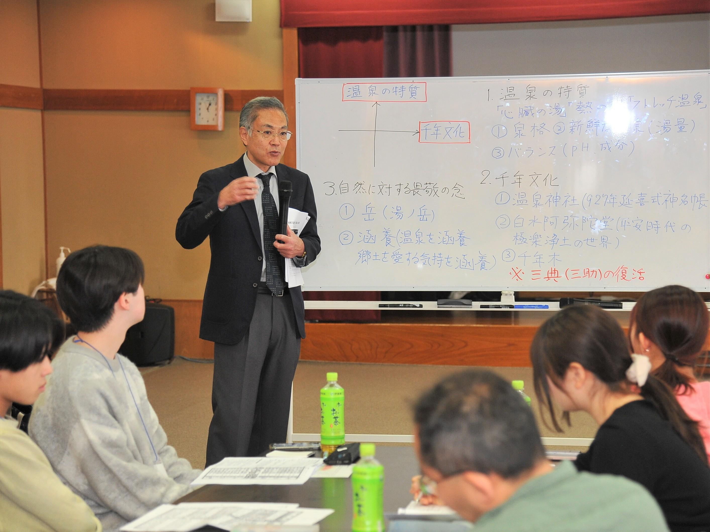 午後からは、日本温泉保養士協会の小野氏、鈴木氏によるいわき湯本温泉の歴史や温泉の効能を学んだ後、入浴と組み合わせることで柔軟性を高める体操を体験しました。