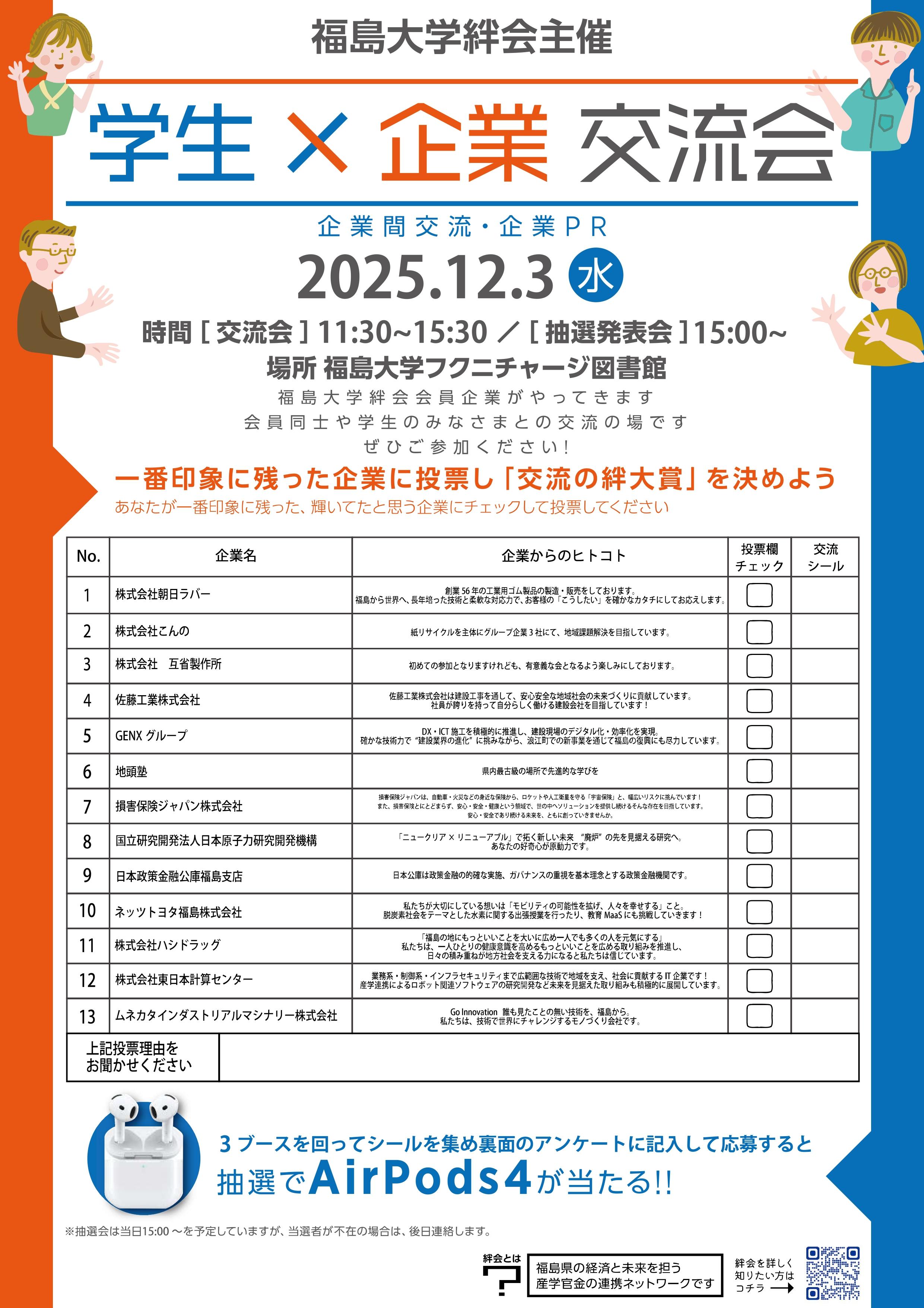 昨年度に引き続き,今年度も福島大学絆会交流会を開催します。今年は,自社の強みや相談事を持ち寄った会員企業13社が,自社PRやビジネスパートナーを探索する場として出展します。