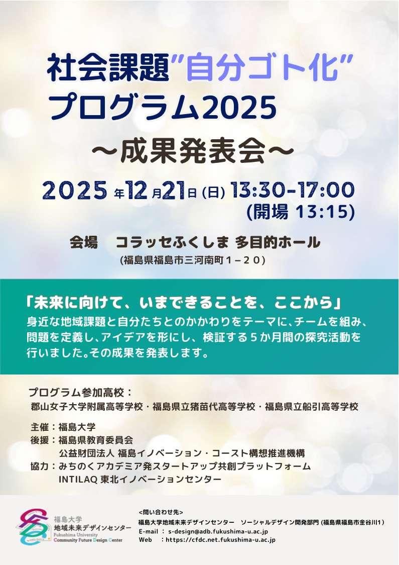 福島大学地域未来デザインセンターでは、社会課題解決型イノベーション人材育成の取り組みを進めております。福島県内の高校生を対象とした教育プログラム、"社会課題解決「自分ゴト化」プログラム2025"では、自分たちの街の地域課題を題材に、高校生が、未来に向けて、いま、ここから、自分たちができることをチーム活動で考えて活動してまいりました。その成果を発表いたします。