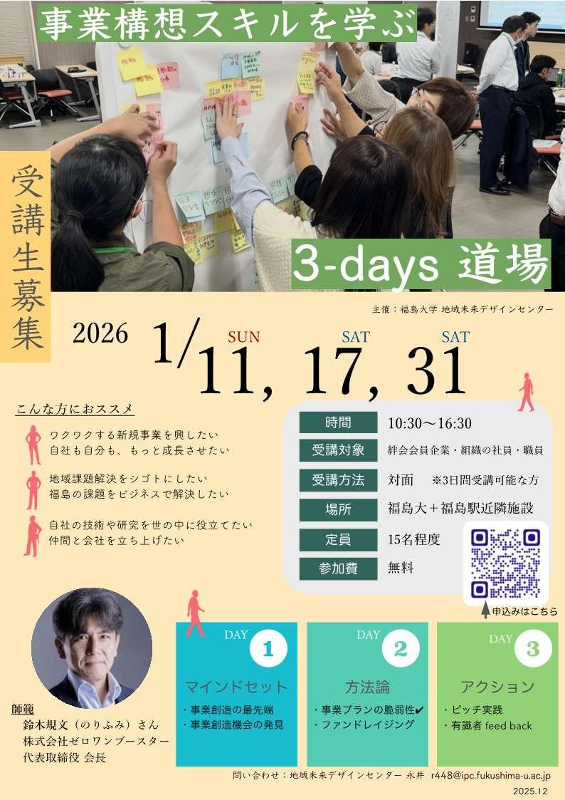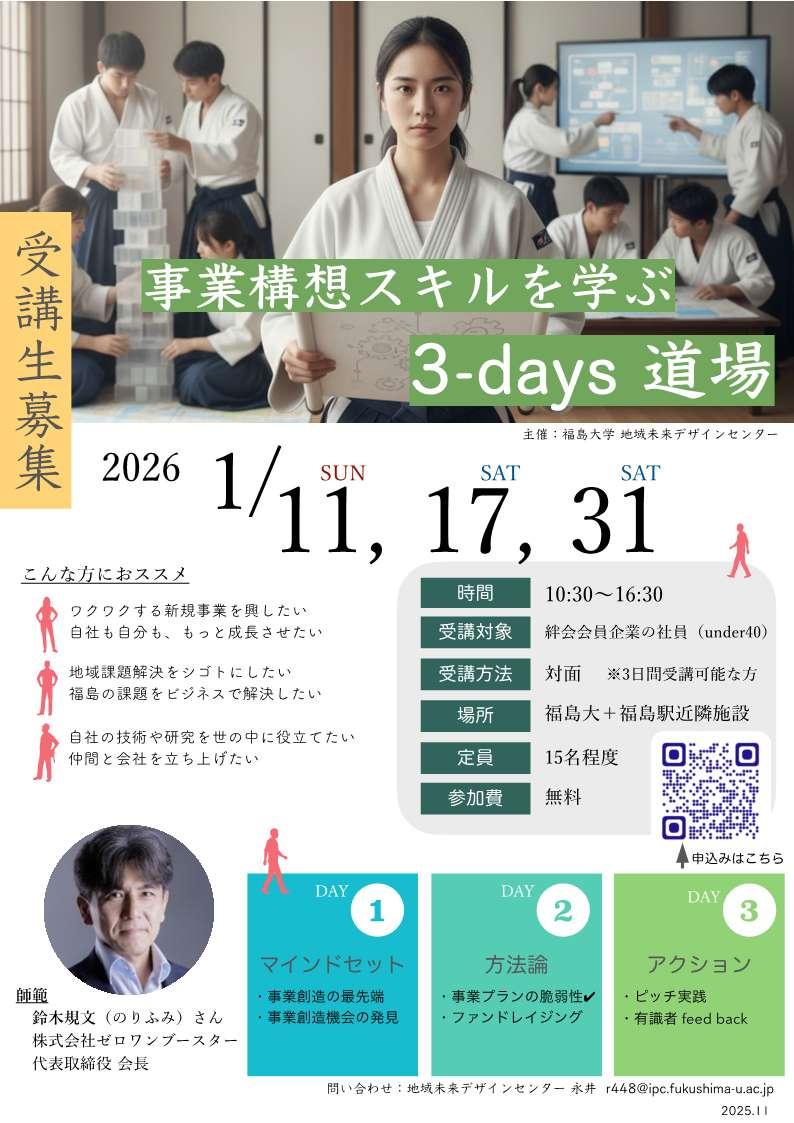 福島大学 地域未来デザインセンター主催で、「事業構想スキルを学ぶ 3-days 道場」を開講します。